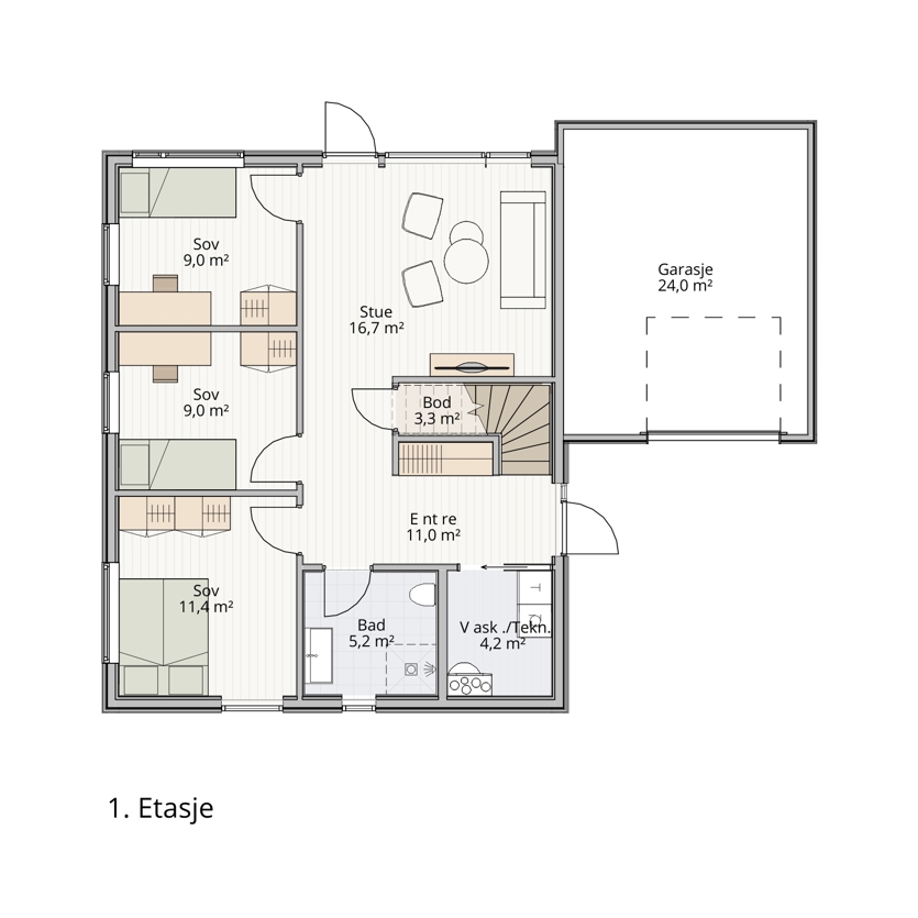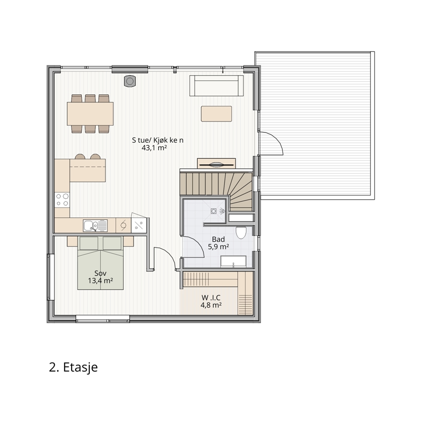 Huset har skrå himling med økt takhøyde mot terrassen slik at man i andre etasje får en flott takhøyde på loftstuen.