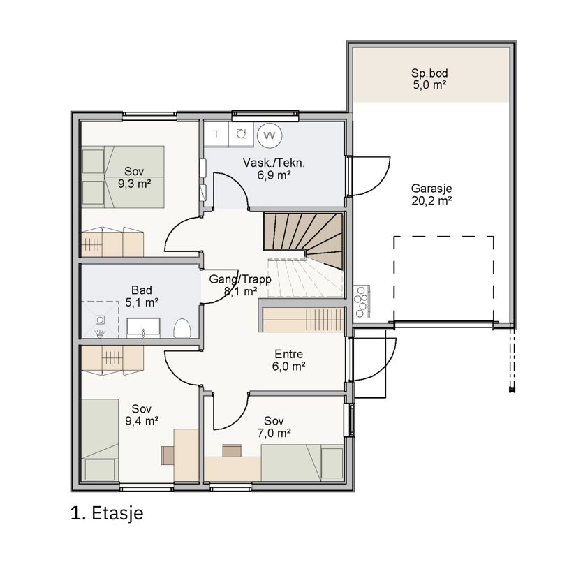 Støle 110 rommer 3 soverom i første etasje i tillegg til hovedbad og et kombinert vaskerom/teknisk rom med tilgang fra utsiden.