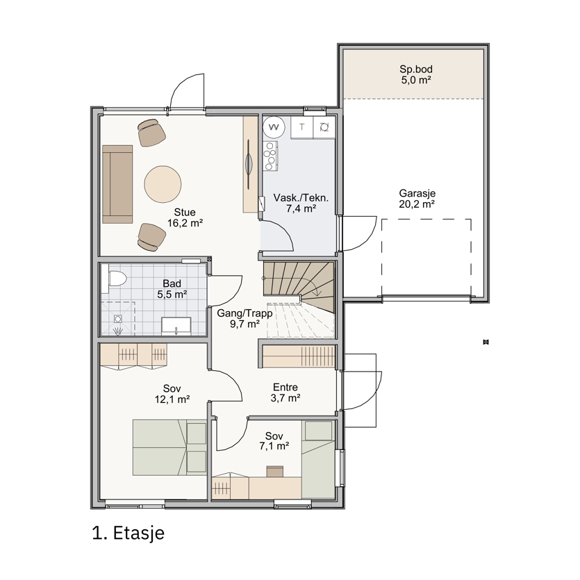 Støle 130 rommer 4 soverom fordelt på to etasjer. I 1.etg. finner man en praktisk tv-stue med direkte utgang til hagen. Her ligger også to soverom, hovedbad og et kombinert vaskerom/teknisk rom med praktisk adkomst fra garasjen.
