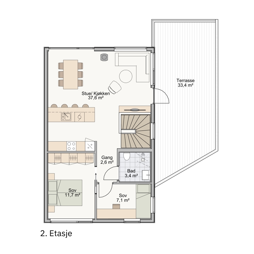Opp trappen kommer man inn i den åpne kjøkken- og stue løsningen hvor store vinduer gir godt med lys. Her er det direkte utgang til terrassen. Andre etasje rommer også to soverom og et bad.