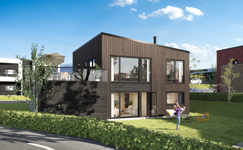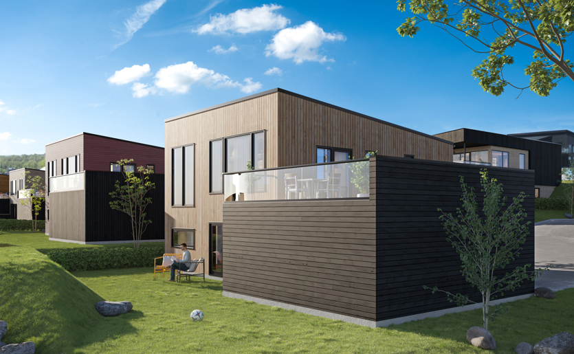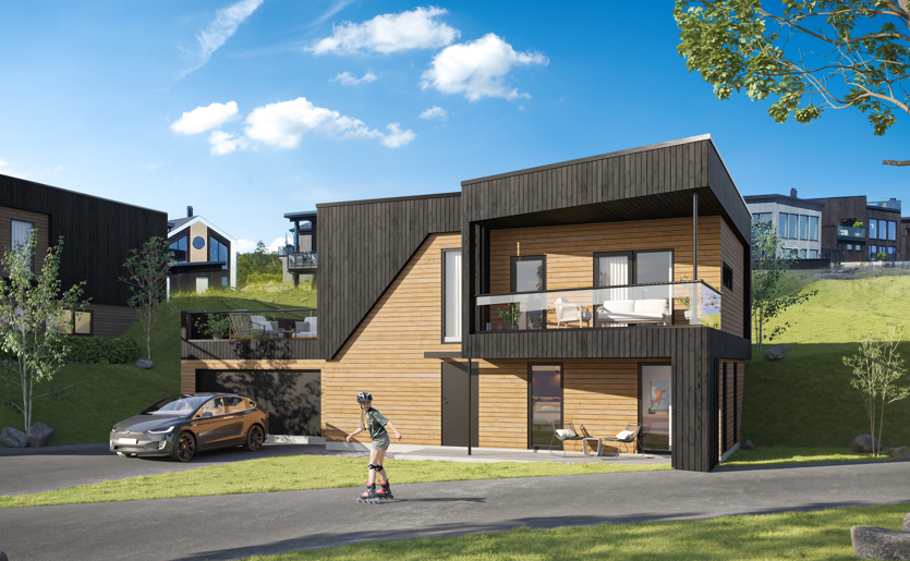 For å kunne tilby en litt mindre bolig i feltet uten å gå på kompromiss av kvalitet og design, utfordret vi Trine Tellefsen (Arkitekt MNAL hos MG Arkitekter) til å skape en ny bolig som tok utgangspunktet i designet og tankene bak Form. Resultatet ble en tøff enebolig i stilrent design som passer veldig godt i nabolaget.