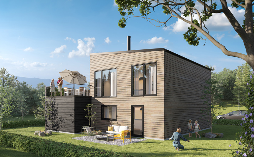 Skansen er et moderne hus med store vindusflater, pulttak og elegant stående trekledning. Samtidig som huset er svært stilig, har det alt en familie trenger.