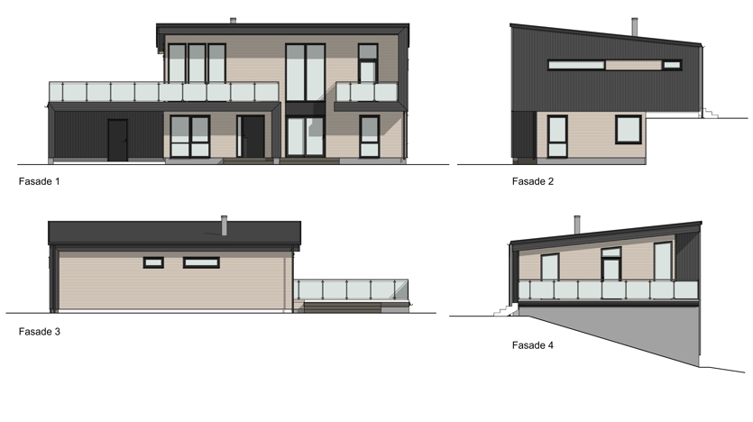 Stor enebolig med en spennende og stram fasade, preget av rene linjer og store vindusflater. To balkonger og terrassen er omgitt av glassrekkverk, som skaper en spennende kontrast til den liggende kledningen i tre.