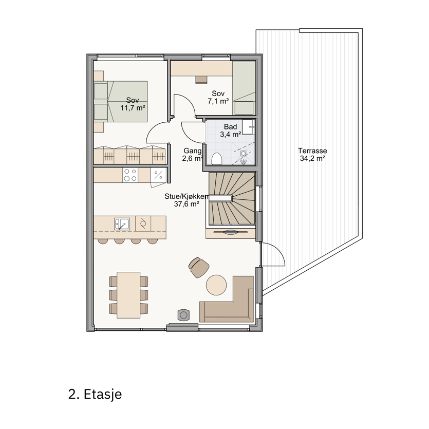 - Direkte utgang til terrassen fra stue.